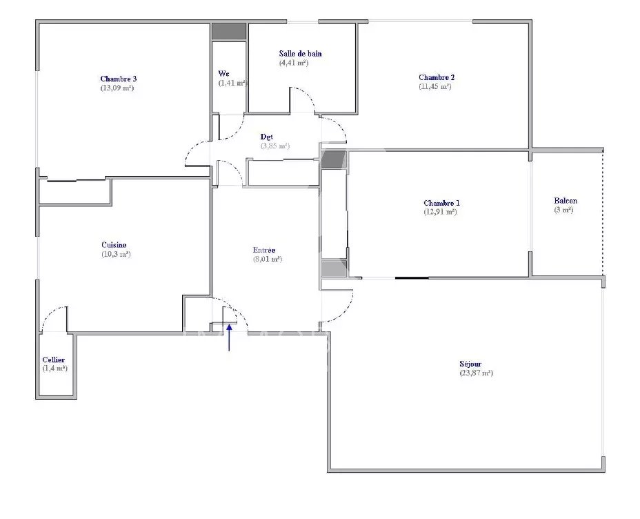Il se compose : d’un hall d’entrée, un séjour lumineux de 24 m² ouvrant sur un balcon exposé ouest, une cuisine indépendante équipée avec accès à un cellier, trois chambres (13 m², 13 m² et 11 m²), une salle de bains et un WC indépendant.